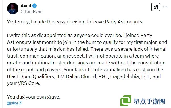 原教練Axed表示離開是“一個簡單的決定”,但他對離隊感到失望。他提到自己上個月加入隊伍是為了爭取晉級Major,但由于最近的事情不得不選擇離開。