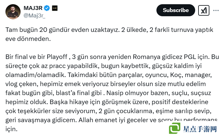 我們經(jīng)歷了一場(chǎng)決賽和一場(chǎng)淘汰賽,三天后我們將前往羅馬尼亞參加PGL。在這段時(shí)間里,我們幾乎沒(méi)有進(jìn)行太多的訓(xùn)練,遺憾的是,今天我們輸了。我的狀態(tài)不佳,表現(xiàn)不理想。團(tuán)隊(duì)的每一位成員——包括選手、教練、經(jīng)理以及記錄我們旅程的人——都在努力實(shí)現(xiàn)一些對(duì)你們有意義的目標(biāo),帶給你們快樂(lè),但像今天這樣的日子,類(lèi)似于BLAST的決賽,有時(shí)就是會(huì)發(fā)生。有時(shí)候,事情就是不如意,我們都要為此承擔(dān)責(zé)任,無(wú)論是否真的有過(guò)錯(cuò)。