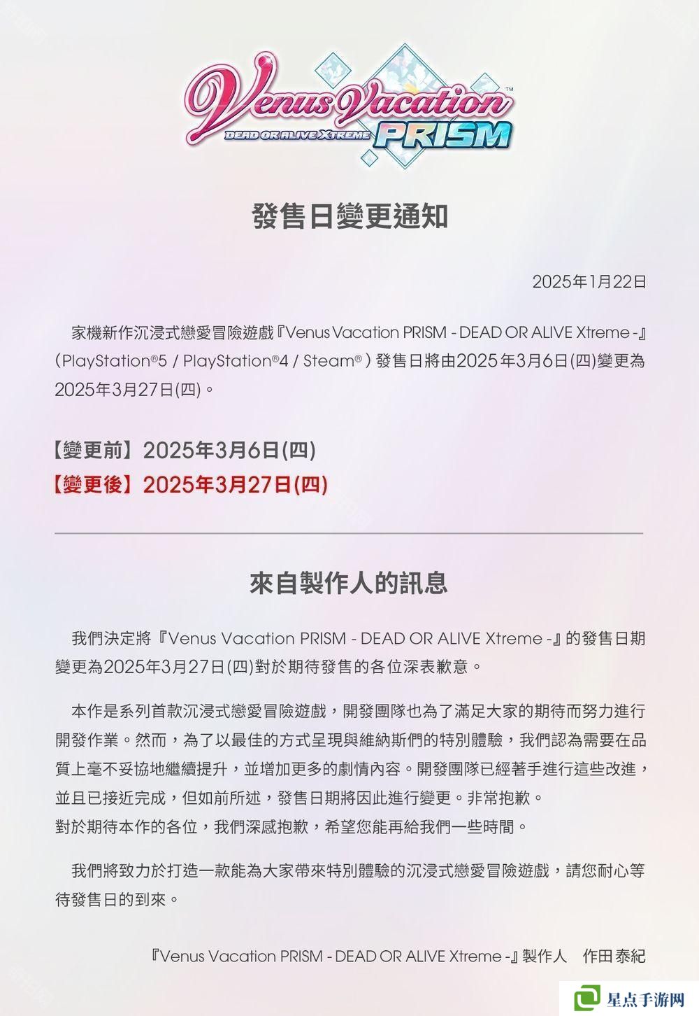 本作原定于今年 3 月 6 日上市,而今日稍早官方宣布將延期至 3 月 27 日,并對此表達歉意。聲明中指出:「本作是該系列首款戀愛冒險游戲,我們一直在努力呈現(xiàn)令玩家滿意的內(nèi)容,而為了以最佳的方式呈現(xiàn)與維納斯們的特別體驗,我們需要毫不妥協(xié)地提高游戲品質(zhì)并增加更多劇情。開發(fā)團隊已著手進行,并已接近完成,但如前述,游戲發(fā)售日期將因此變更。我們對此深感抱歉,希望玩家能再耐心等待一段時間。我們將致力于打造一款身歷其境的浪漫冒險游戲,請耐心等待游戲發(fā)售日的到來?!?/p>