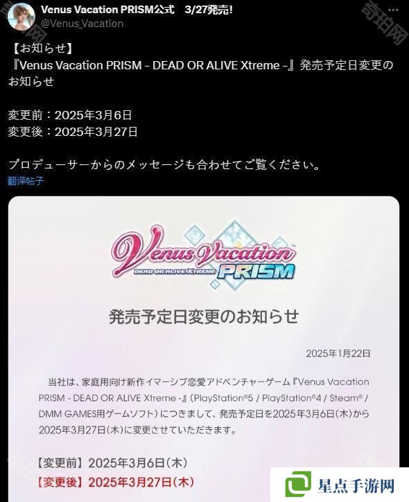 光榮特庫摩宣布,沉浸式戀愛冒險游戲《生死格斗:沙灘排球 維納斯璀璨假期(Venus Vacation PRISM - DEAD OR ALIVE Xtreme -)》將延期至 3 月 27 日發(fā)售。