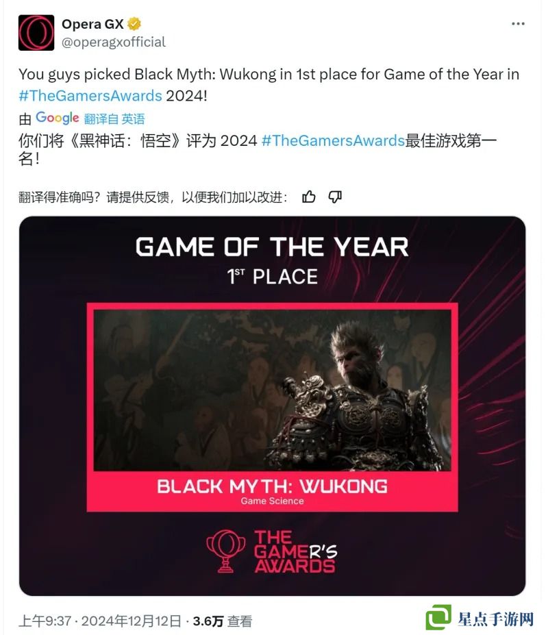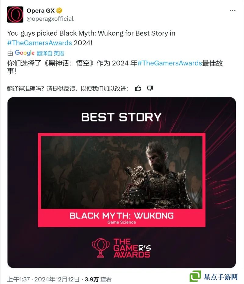 ??黑神話悟空在Opera GX舉辦的玩家票選活動(dòng)中獲得了【年度最佳游戲】和【最佳敘事】?jī)身?xiàng)大獎(jiǎng)??。