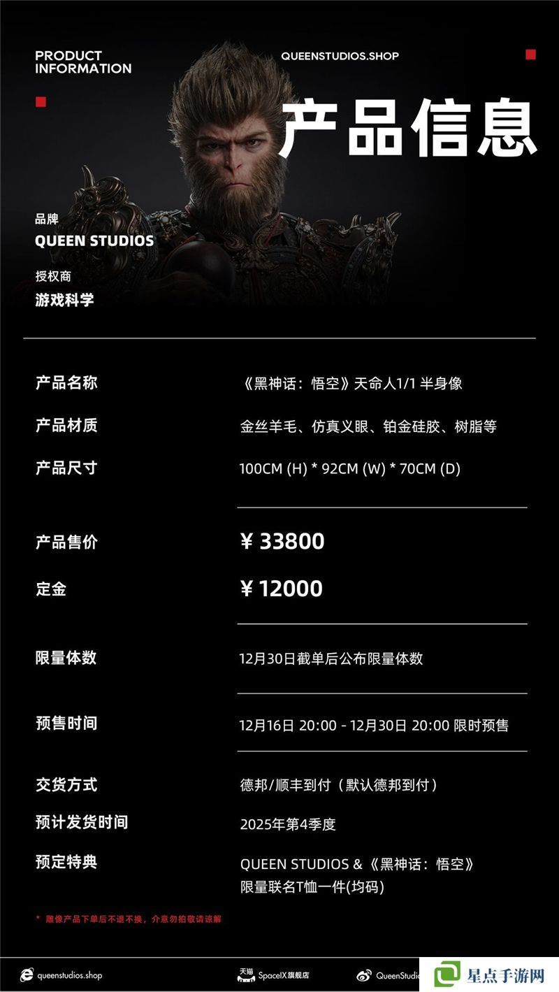 黑神話悟空主角天命人1:1半身立像的售價(jià)為33800元?,定金為12000元?。