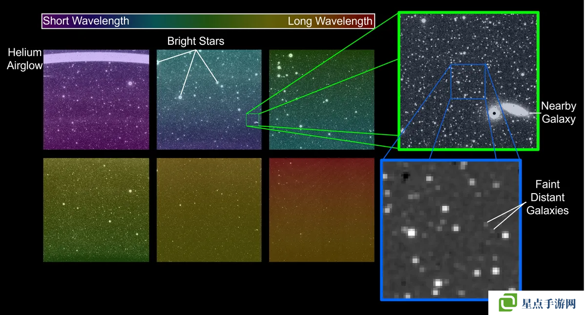 基本上,上方并列的六個面板分別代表了 SPHEREx 的六個探測器之一。聲明指出:“SPHEREx 的完整視場覆蓋了上方三張圖像;下方三張圖像也捕捉到了同一片天空區(qū)域?!?/p>