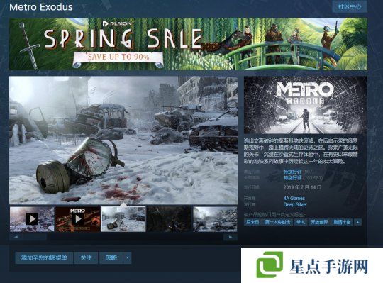 《地鐵:逃離》于2019年2月發(fā)售,目前正在Steam春季促銷中,原價148元,現(xiàn)降價75%,售價37元(史低價為14.8元),支持簡體中文。該作獲得玩家“特別好評”評價。