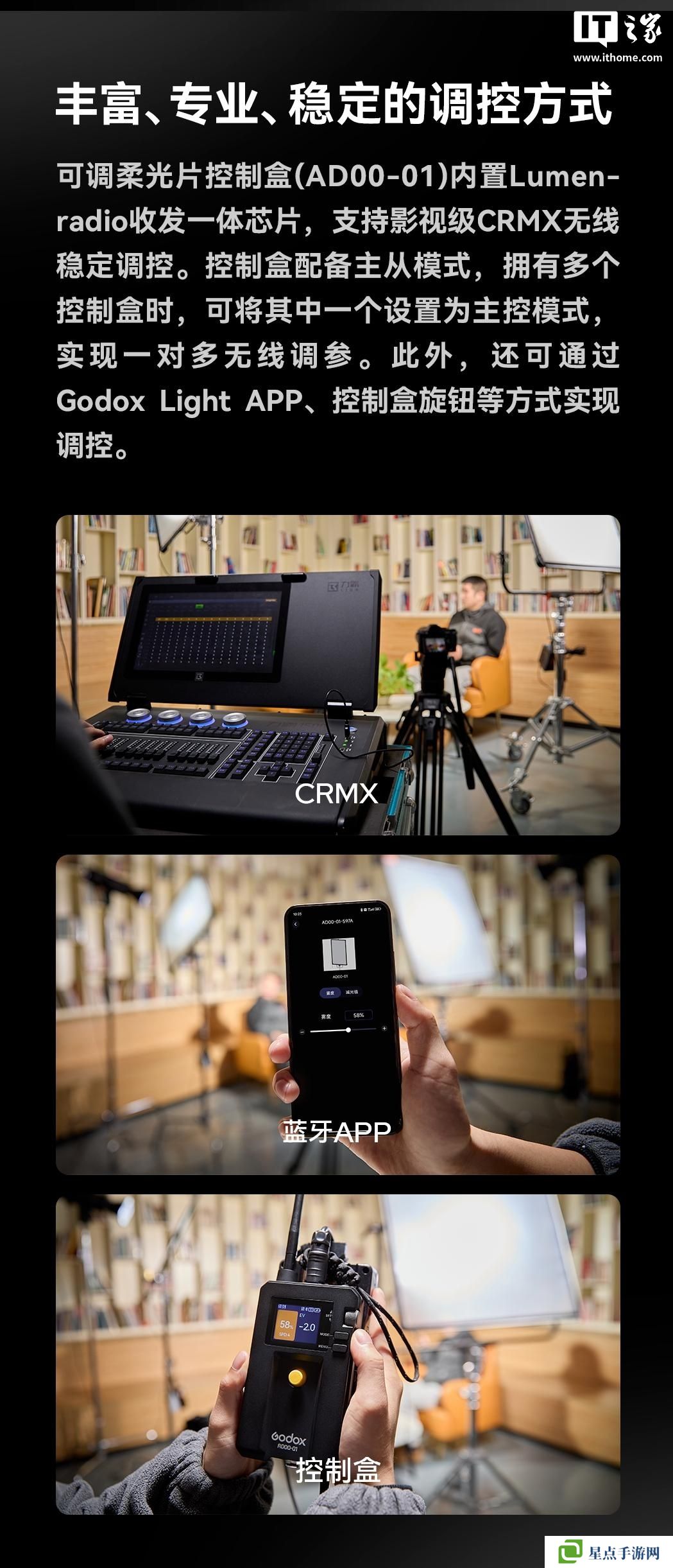 在調控方式方面,該系列可調柔光片的控制盒(AD00-01)內置 Lumen- radio 收發(fā)一體芯片,支持影視級 CRMX 無線穩(wěn)定調控,此外還支持手機 App、控制盒旋鈕等方式調控。