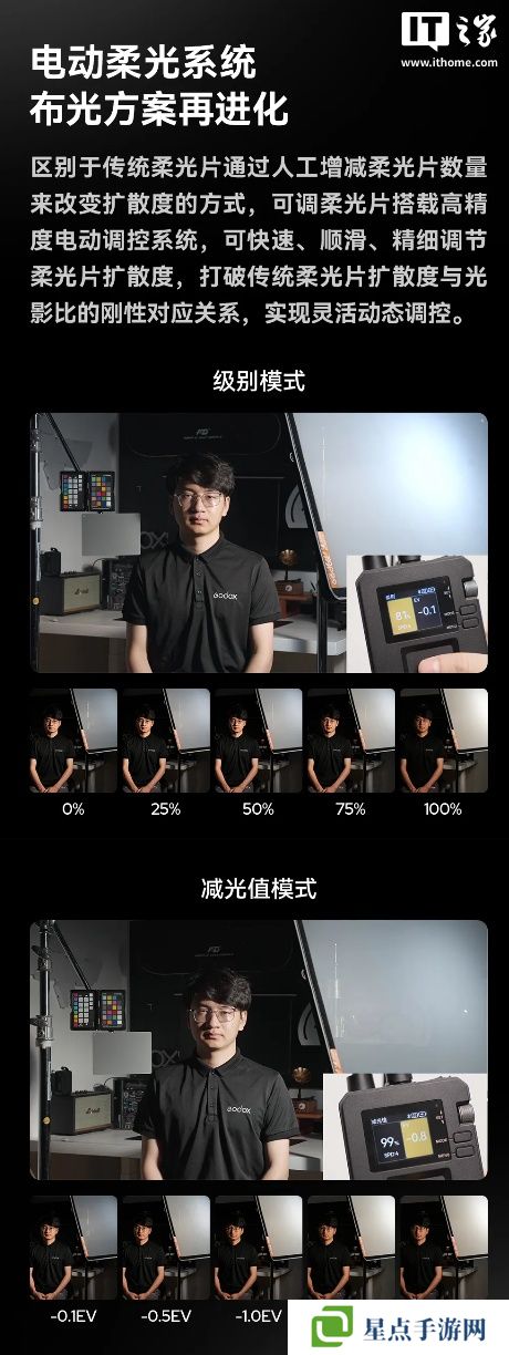根據(jù)神牛官方介紹,該系列可調柔光片區(qū)別于傳統(tǒng)柔光片通過人工增減柔光片數(shù)量來改變光擴散度的方式,搭載電動調控系統(tǒng),可一鍵調節(jié)柔光片擴散度,擁有級別模式和減光值兩種調控模式,級別模式可在 0~100% 的百分比值之間可視化快速調節(jié),減光值模式支持-0.1~-2.0EV 的調控,更貼合專業(yè)用戶的習慣,實現(xiàn)靈活動態(tài)調控。