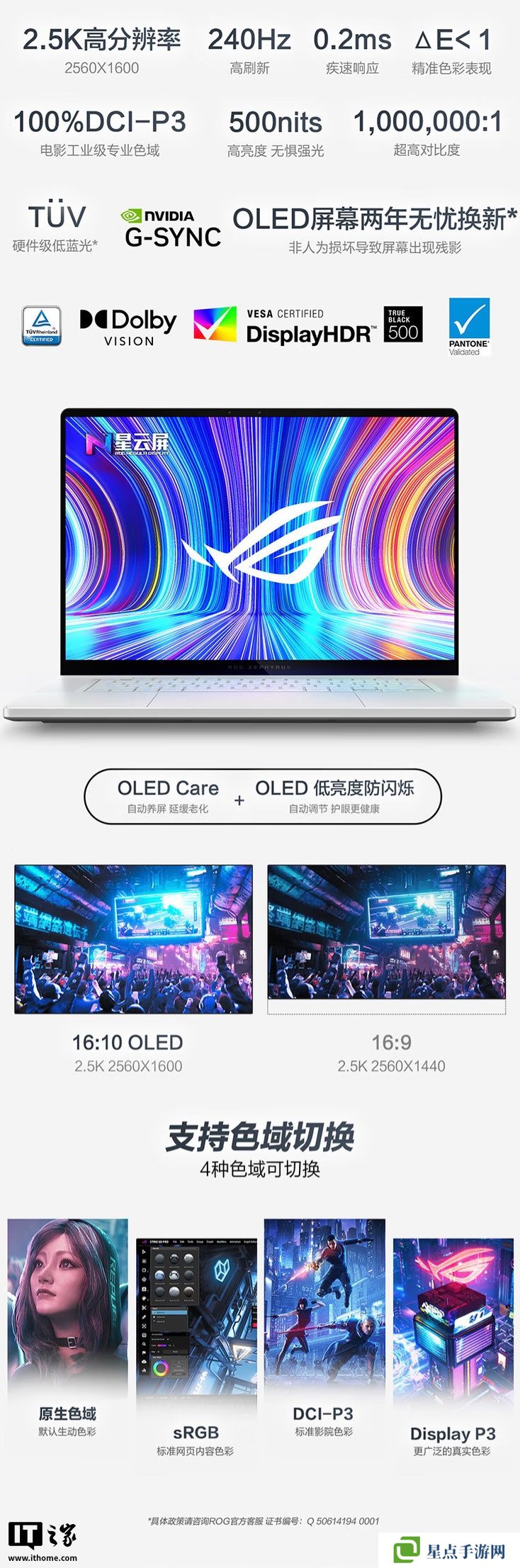 該機配備一塊16英寸2560x1600分辨率240Hz OLED面板,響應速度0.2ms,支持500尼特色彩,動態(tài)對比度1 百萬:1,覆蓋 100% DCI-P3色域。