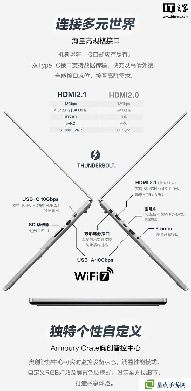 I/O方面,該機左側配備1個 HDMI 2.1接口、1 個雷電 4 接口、1個 USB-A 10Gbps接口、1個 3.5mm音頻接口;右側配備1個 USB-C 10Gbps接口、1個 USB-A 10Gbps接口、1個 SD卡讀卡器。