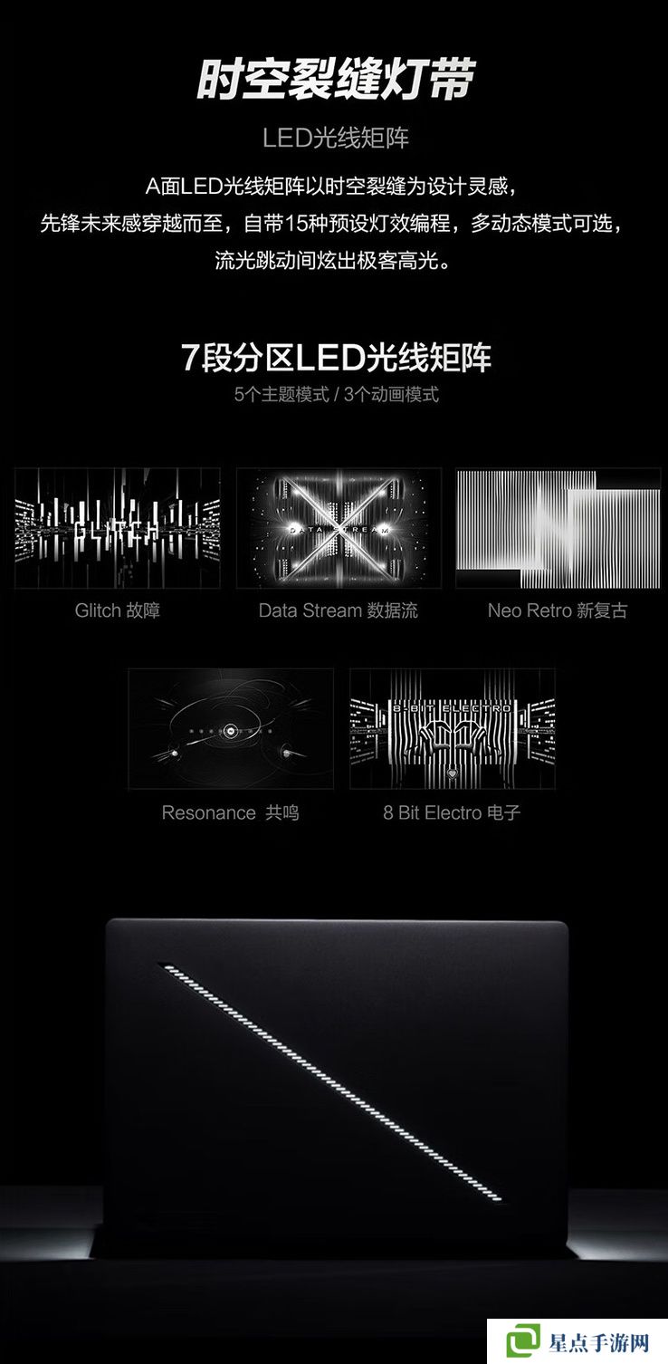 這款筆記本可選鉑月白 / 日蝕灰兩種配色,筆記本使用航空鋁一體化機身,A 面配備ROG光顯矩陣燈效,整體重量1.95千克,厚度1.49厘米,內置6揚聲器,配備90Wh電池,支持100W PD快充。