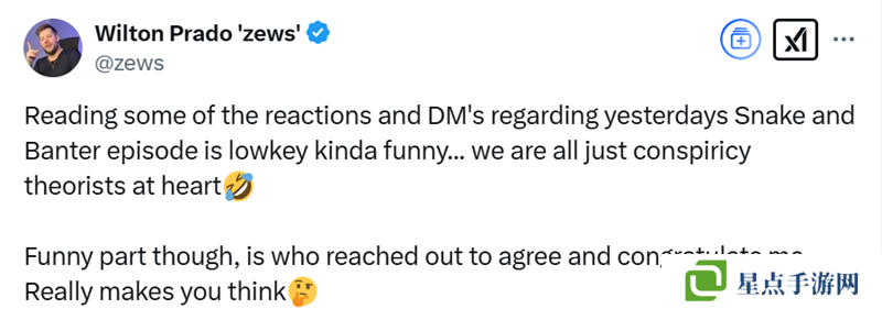 “看看關(guān)于昨天《Snake and Banter》節(jié)目的一些反應(yīng)和私信,還挺搞笑的…… 本質(zhì)上我們都是陰謀論者呢。