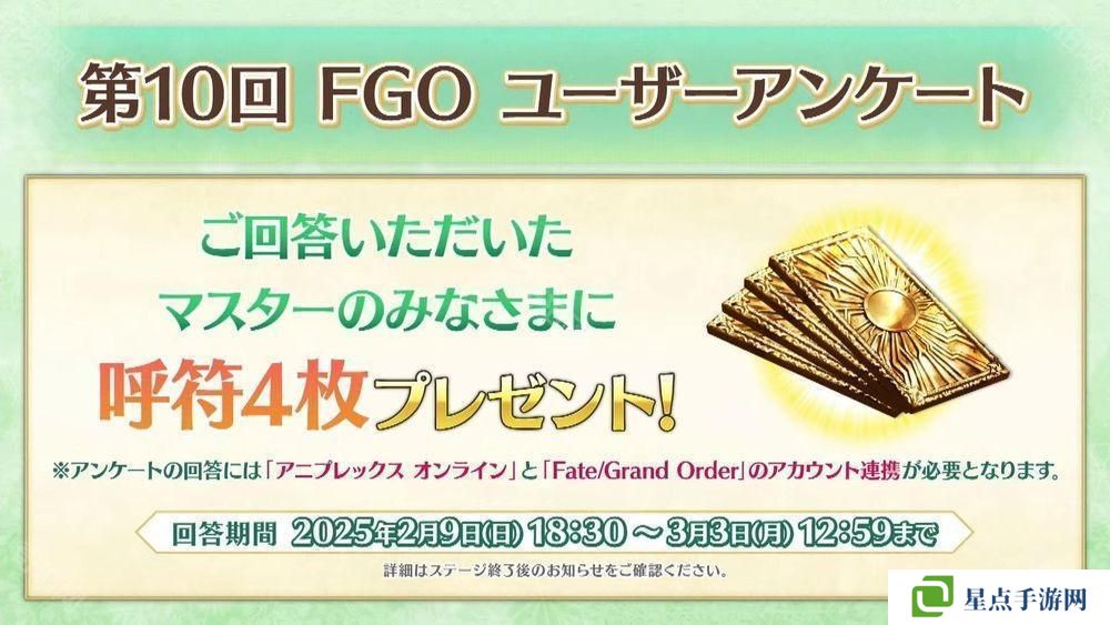 期間內(nèi) 2 月 9 日~3 月 3 日實施第 10 次《Fate/Grand Order》用戶問券調(diào)查,完成問券即可獲得唿符 4 張。