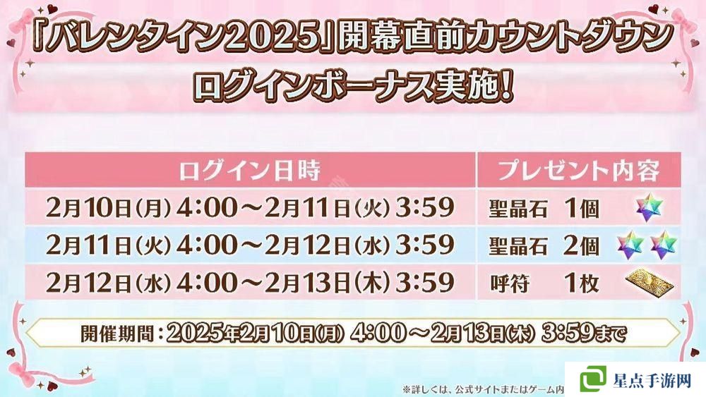 為紀念期間限定活動『情人節(jié) 2025』舉行,期間內(nèi) 2 月 10 日~2 月 12 日實施開幕前倒數(shù)實當日限定登入獎勵。