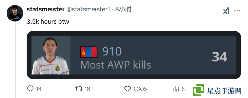 順便提一句,他才玩了3500小時(910拿下34個AWP擊殺)。