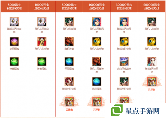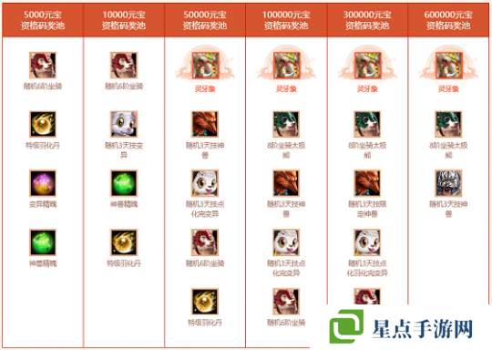 普通版玩家有機(jī)會(huì)贏(yíng)得八階坐騎靈牙象、隨**階或九階坐騎(僅至尊系列)、隨機(jī)元靈、點(diǎn)化羽化滿(mǎn)的神獸、隨機(jī)變異等獎(jiǎng)勵(lì)。