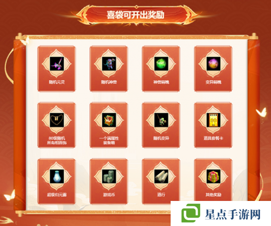 喜袋內(nèi)含豐富獎(jiǎng)勵(lì),普通版的道友有機(jī)會(huì)開(kāi)出隨機(jī)元靈(元靈從赤天、混沌、笛舞、降魔、夫諸、震魃中隨機(jī)開(kāi)出)、隨機(jī)神獸、變異、神獸精魄、變異精魄、滿(mǎn)屬性裝備箱、80級(jí)隨機(jī)所有相首飾、道具套餐卡、商城道具、道行,游戲幣等。