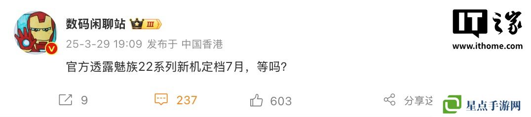 本站 3 月 29 日消息,博主@數(shù)碼閑聊站 發(fā)文,稱“官方透露魅族 22 系列新機(jī)定檔 7 月”,不過其暫未公布系列手機(jī)具體規(guī)格信息。