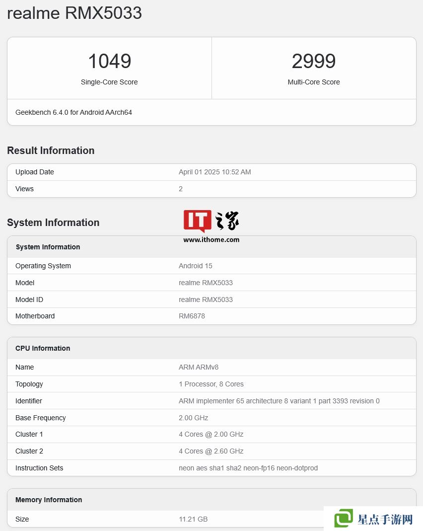 本站 4 月 2 日消息,科技媒體 xpertpick 昨日(4 月 1 日)發(fā)布博文,報道稱 realme 真我 Narzo 80 Pro 手機(型號 RMX5033)現(xiàn)身 Geekbench 跑分平臺,確認搭載聯(lián)發(fā)科天璣 7400 芯片,單核 / 多核得分分別為 1049/2999,配備 12GB 內(nèi)存與安卓15 系統(tǒng)。
