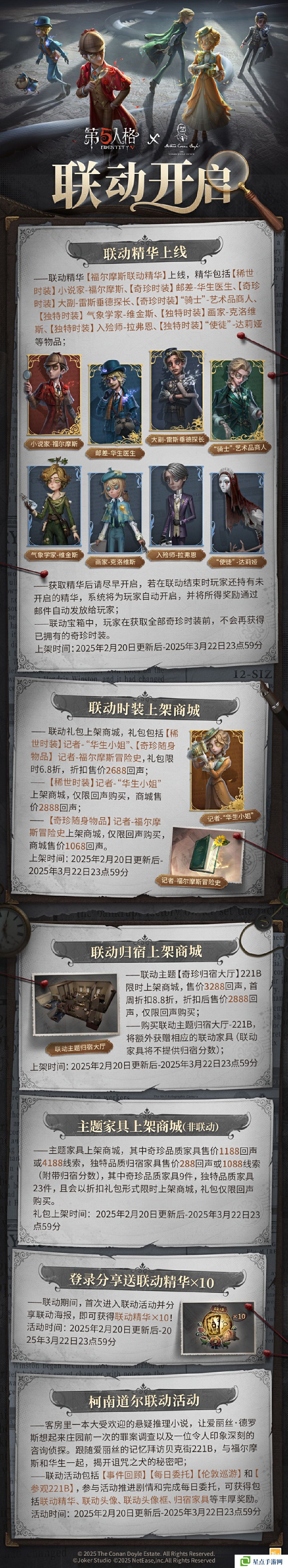 第五人格和福爾摩斯Sherlock Holmes聯(lián)動就要來啦,本次聯(lián)動有全新時(shí)裝、奇珍上線,大家知道有哪些嗎?下面為大家?guī)淼木唧w內(nèi)容,感興趣的玩家們千萬不要錯(cuò)過哦!