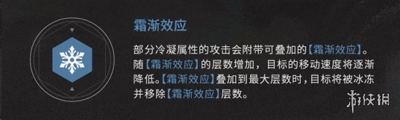 部分冷凝屬性的攻擊會(huì)附帶可疊加的【霜漸效應(yīng)】。隨【霜漸效應(yīng)】的層數(shù)增加,目標(biāo)的移動(dòng)速度將逐漸降低?!舅獫u效應(yīng)】疊加到最大層數(shù)時(shí),目標(biāo)將被冰凍并移除【霜漸效應(yīng)】層數(shù)。
