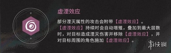 部分湮滅屬性的攻擊會(huì)附帶【虛效應(yīng)】【虛湮效應(yīng)】持續(xù)時(shí)會(huì)自動(dòng)增殖,疊加到最大層數(shù)時(shí),對(duì)目標(biāo)造成湮滅傷害并移除【虛*效應(yīng)】,并對(duì)目標(biāo)周?chē)慕巧┘印咎撲涡?yīng)】。