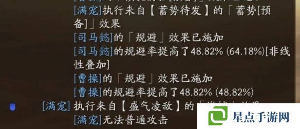 3)每回合概率獲得概率的規(guī)避,吃智力加成。比如:受形一智力加成的滿寵用蓄勢規(guī)避概率可達(dá)將近50%。