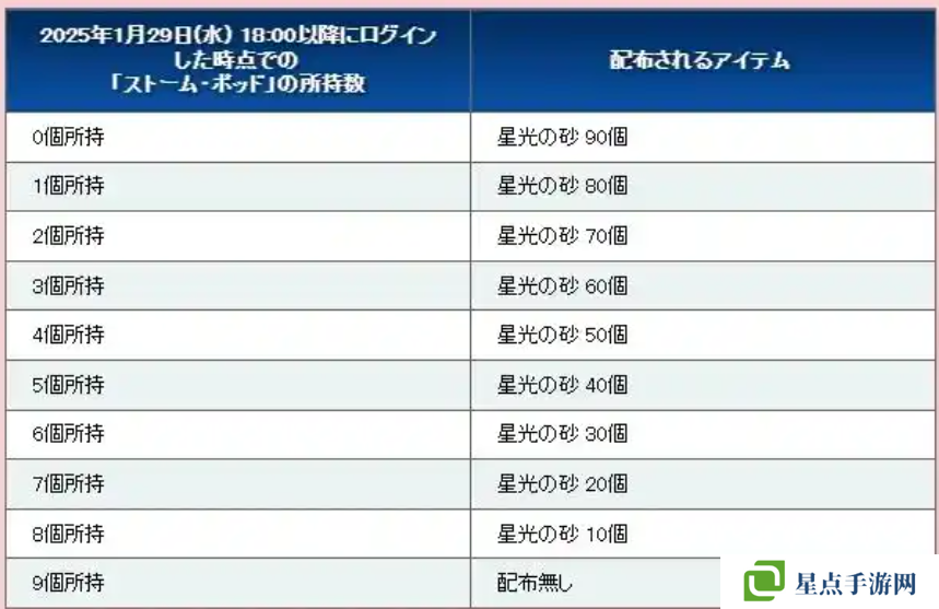 為了不讓獲取的星光之砂有所差異,也會根據風暴罐當前的庫存量進行補償,補償數量如上表,簡單說,就是如果你全用了,就補償你90個星光之砂,每剩下1個風暴罐就會少10個星光之砂的補償。