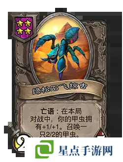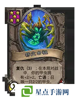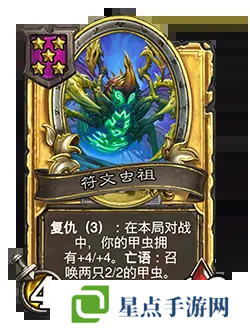 改動(dòng)前:2/7。復(fù)仇(4):你的甲蟲在本局對(duì)戰(zhàn)中擁有+2/+2。亡語(yǔ):召喚一只2/2的甲蟲。