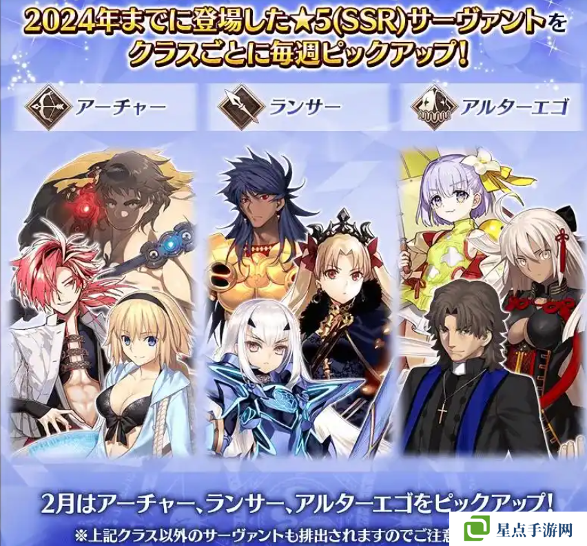 另外還預(yù)告了2月即將開啟的全從者周替UP的名單,卡池從2月3日開始,UP的職階分別是弓階的第二個(gè)卡池,槍階估計(jì)是分成兩個(gè)卡池,第四個(gè)卡池的AE階,具體的時(shí)間安排還是以到時(shí)候的正式公告為準(zhǔn)吧。