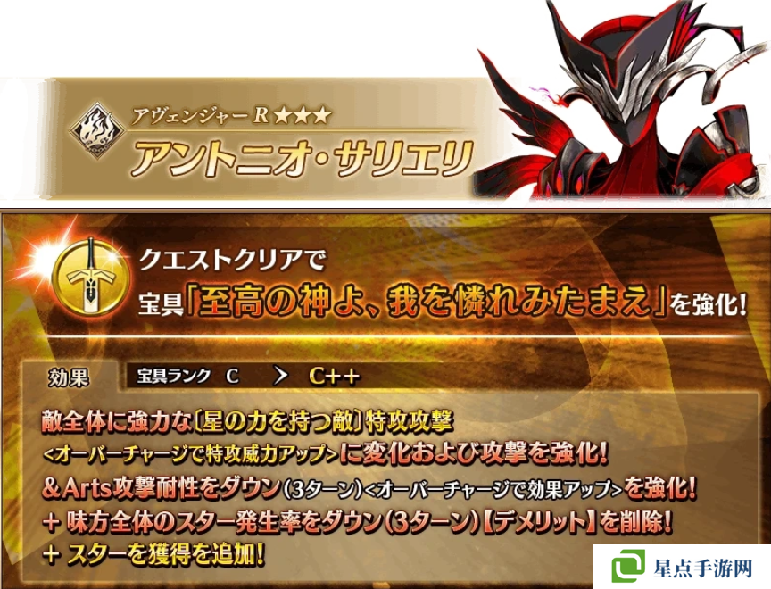 強(qiáng)化后首先是整體的寶具倍率得到了提升,然后把負(fù)面效果刪除了,原本的效果提升,把藍(lán)卡攻擊耐性下降幅度提高到了40%,額外追加了兩個(gè)效果,一個(gè)是對〔擁有星之力的敵人〕特攻100%~200%,另外一個(gè)就是獲得10個(gè)暴擊星。
