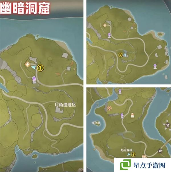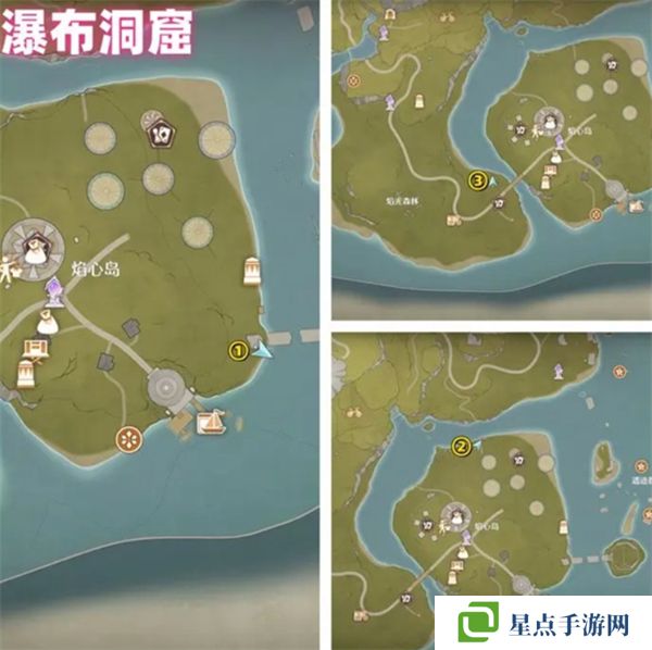 花焰群島一共有4個洞窟,每個洞窟有三個煙花筒,唯有全部3個點燃后才能進入洞窟中,具體煙花筒位置參考下圖:
