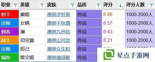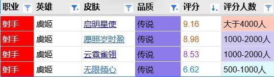 虞姬憑借年限成為了第5位四傳說英雄(香香貂蟬昭君呂布),也是第2位皮膚標簽各不相同的九皮膚英雄(還有昭君)。她也成為了李信之后,峽谷第2位有兩款9分+傳說皮的英雄。她的傳說皮整體品質確實很高,在所有的四傳說英雄中,虞姬的全傳說皮平均分是最高的,達到了8.3分。